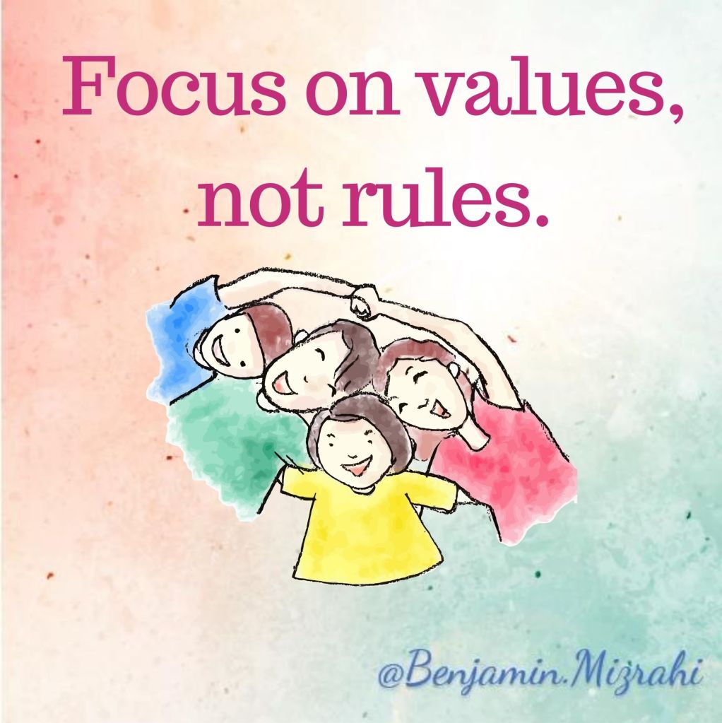 Focus on values, not rules. When you have clearly defined what’s important to you as a family, your child internalizes your values and can use them to guide their behavior in any situation. Remember that it takes time and practice before your child will internalize some values and live by them. Be patient and be hopeful.