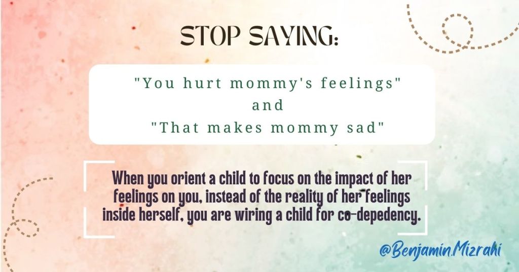 Don’t wire your child so that her feelings sit right next to their impact on you. This is not a way to create empathic kids; it is a way to create co-dependent adults.